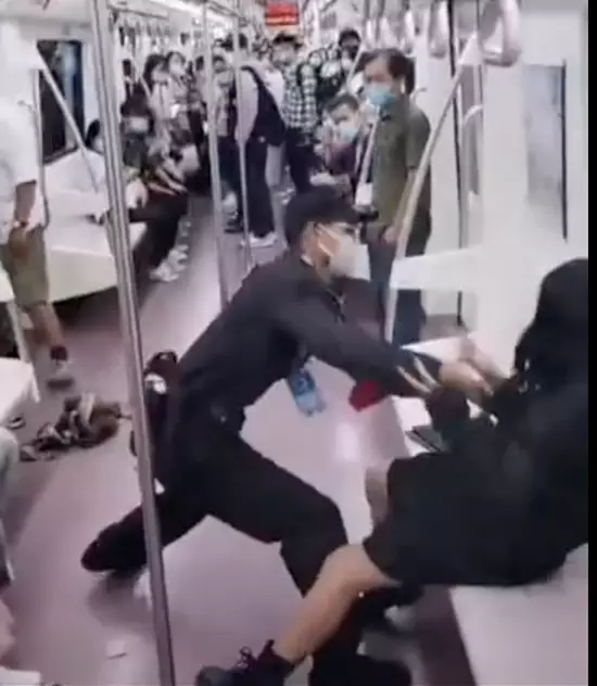 網傳視頻顯示,一位穿黑色連衣裙的女子在地鐵車廂與一位中老年男子發生言語衝突,地上散落著斷成幾節的雨傘,女子要求男子加微信及賠償。地鐵保安上前,男子說「你把她抓起來」,女子仍多次喊“加我微信”。保安突然將女子拖拽出車廂,過程中女子衣不蔽體,大喊“我的身份證還在裏面”,之後跑回車廂,並要求調取監控。