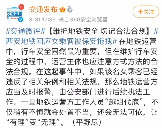 昨天,中國交通報官方微博「交通發佈」發表評論《維護地鐵安全 切記合法合規》稱,在地鐵運營中,行車安全固然最為重要,但在維護行車安全的過程中,運營主體也應注意方式方法的合法合規。“在這起事件中,如果該名女乘客已經違反了相關條例和相關法規,那麼地鐵運營方應當及時報警,由公安部門進行後續執法工作。一旦地鐵運營方工作人員‘越俎代庖’,不僅稍有不慎就會處置不當,還會無法可依,讓‘有理’變‘無理’。”