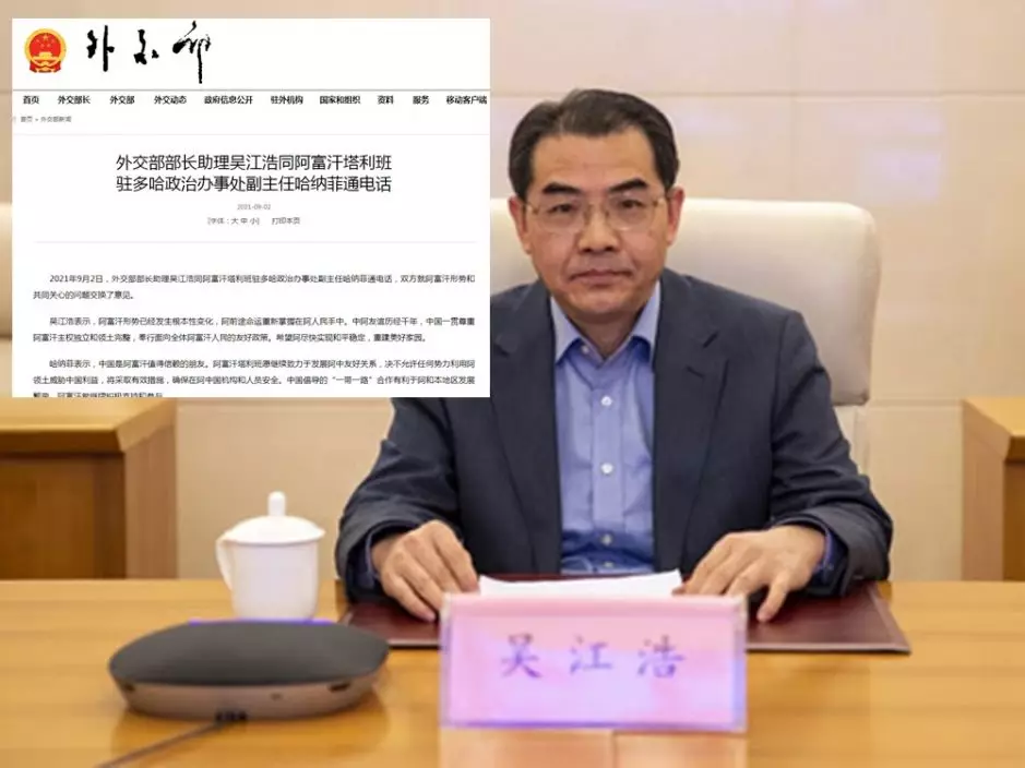 中國外交部部長助理吳江浩與阿富汗塔利班駐多哈政治辦事處副主任哈納菲通電話,就阿富汗形勢和共同關心的問題交換意見。
