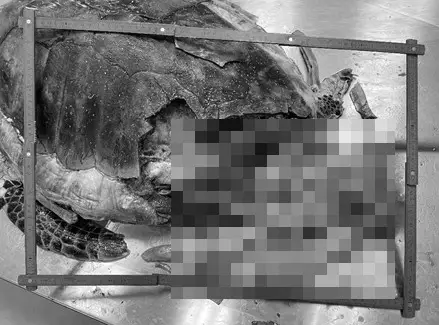 研究組經過兩日影像解剖以及傳統解剖,發現綠海龜背甲同腹部都有被船隻撞擊的明顯傷痕,身體內肌肉組織亦有瘀血,相信撞擊是生前造成;食道有一個魚鈎,胃部有大量食物,包括海草以及未消化的魚類。
