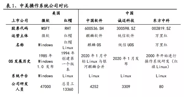 中美操作系統公司的比較圖。興業證券2020年7月研報截圖