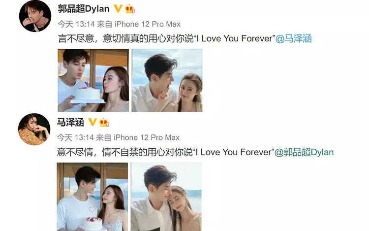 二人各自在微博上載合照,並同時留言:「言不盡意,意切情真的用心對你說,I Love You Forever!」內地網民都大讚他們很登對,紛紛留言祝福。