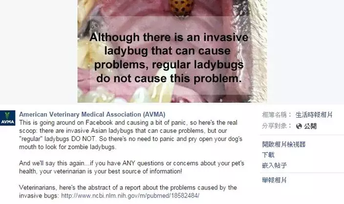 照片引起美國獸醫協會的注意,他們認為圖中的瓢蟲並非會分泌毒素的「亞洲瓢蟲」(Asian ladybirds),應該不會損害狗狗的健康。專家解釋,狗隻有時會捉昆蟲食,如果昆蟲有毒或有寄生蟲,就可能損害狗隻健康。