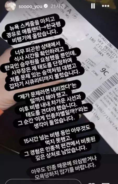 韶宥10月19日在個人Instagram發文,表示在美國返韓的長途班機上,疑似因種族歧視遭到不公對待。韶宥IG圖片