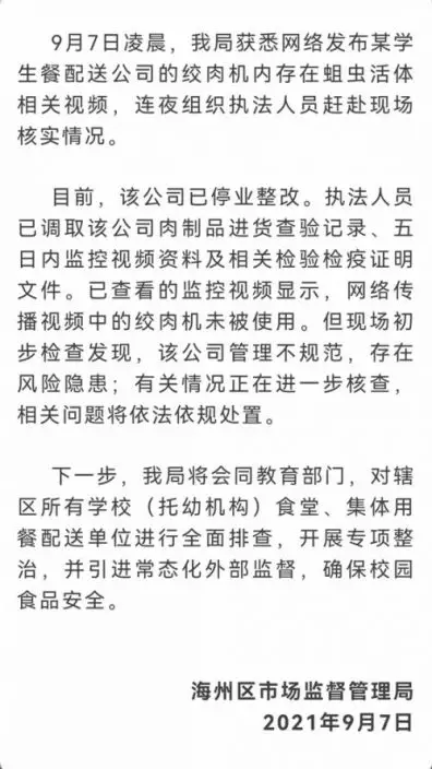 9月7日凌晨,連雲港市海州區市場監督管理局獲悉,網路發佈某學生餐配送公司的絞肉機內存在蛆蟲活體相關視頻,連夜組織執法人員趕赴現場核實情況。