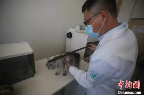 科研人員對克隆貓「平安」進行數據測量。 衣冠超 攝