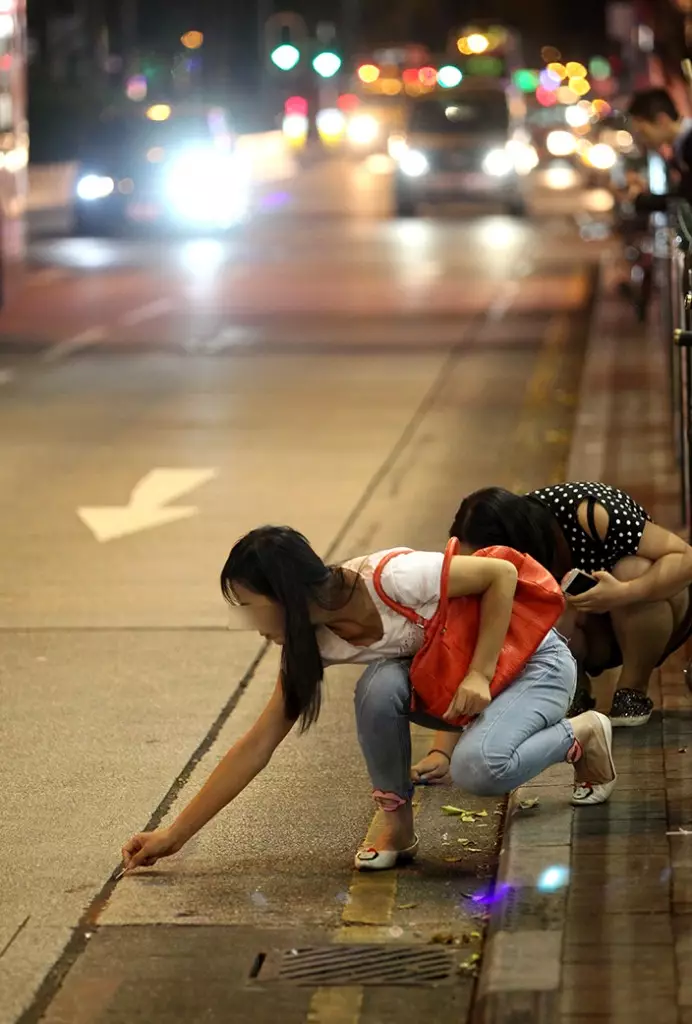 昨晚8時許,一批碎「鑽石」突然從天而降,跌落行人路上,部分更濺彈往馬路,有途人發現,爭相蹲在地上尋寶,其中不少人用牙籤又撩又挖,該處雖與警署僅距500米之遙,惟竟無人報警,歷時10多分鐘,眾人奪得戰利品後始告散去。