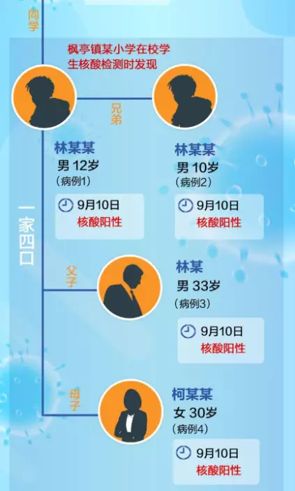 這兩名學生為親兄弟,哥哥12歲,弟弟10歲。擴大採樣後很快發現,兩兄弟的父母,以及一位同學林某某、林某某的父親也呈核酸陽性。