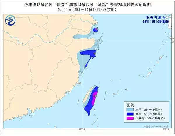 降水預報:11日14時至12日14時,浙江東部、上海、台灣島、海南島等地的部分地區有大雨或暴雨,局地大暴雨(100-140毫米)。