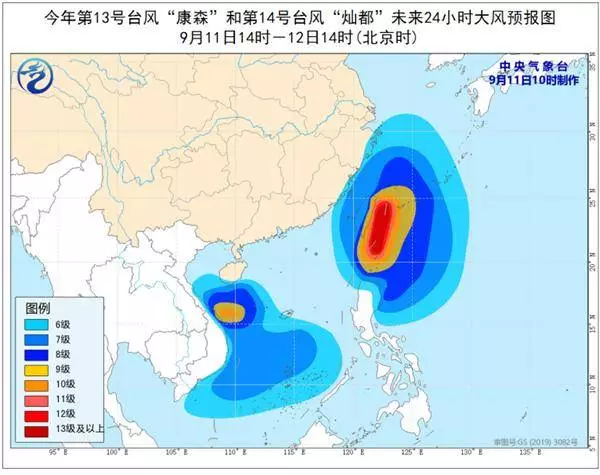 大風預報:11日14時至12日14時,受「燦都」影響,東海大部海域及釣魚島附近海域、台灣海峽、巴士海峽、台灣以東洋面、浙江沿海、福建中北部沿海、台灣島沿海將有6-7級大風,其中,巴士海峽、台灣島以東洋面、東海西南部海域、台灣東部沿海的風力有8-11級、部分海域風力可達12-14級,陣風15-16級,颱風中心經過的海域或地區風力有15-16級,陣風17級;受「康森」影響,南海西部和南部、海南島南部沿海、西沙群島、中沙群島、南沙群島將有6-7級大風,其中,南海西部的部分海域風力有8-10級,陣風11-12級。
