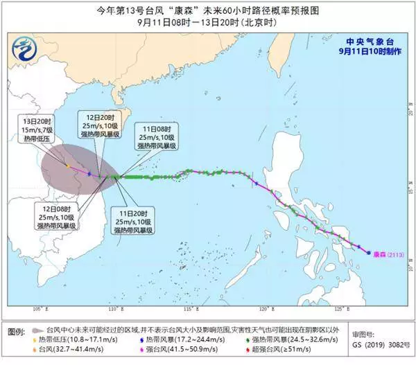 預計,「康森」將以每小時5-10公里的速度向偏西方向移動,強度緩慢減弱,將於13日早晨登陸越南中部一帶沿海。