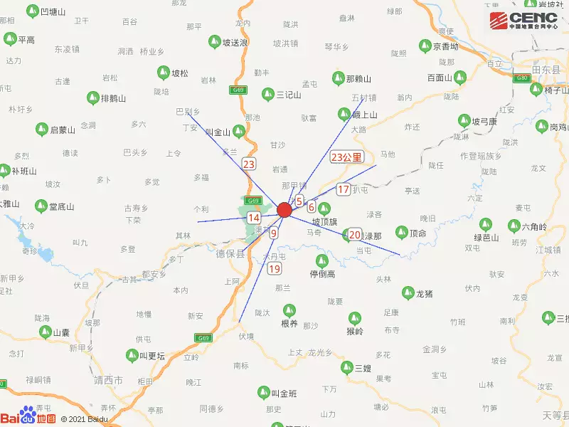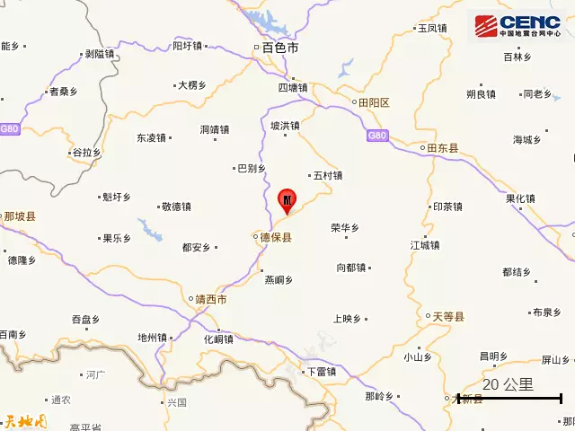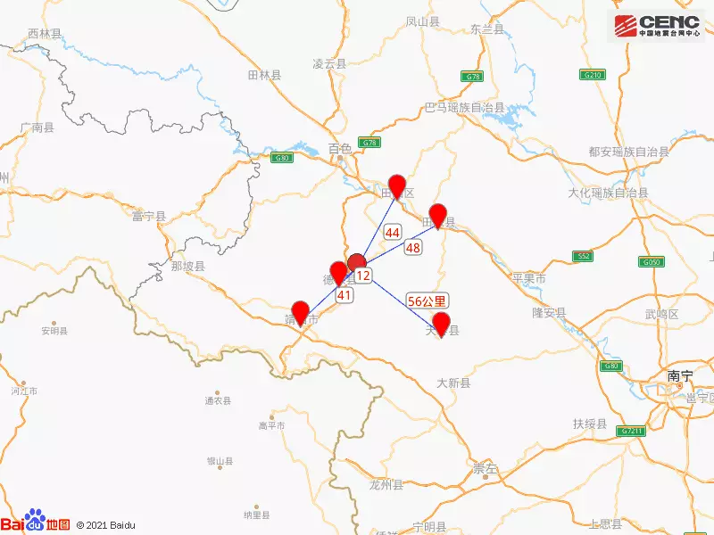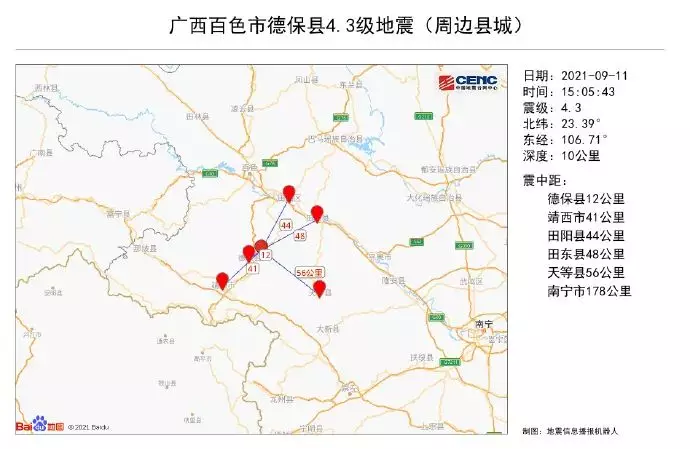 周邊縣城: 震中距德保縣12公里、距靖西市41公里、距田陽區44公里、距田東縣48公里、距天等縣56公里,距百色市58公里,距南寧市178公里。