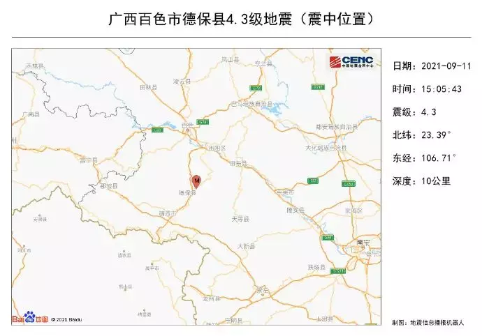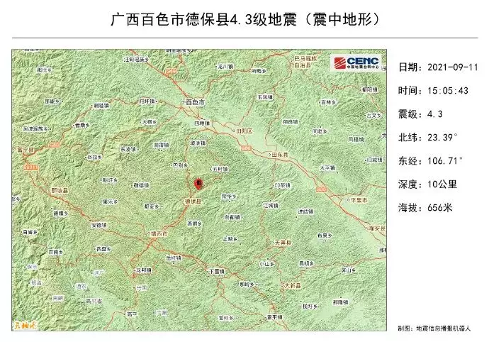 據中國地震台網正式測定,9月11日15時5分在廣西百色市德保縣發生4.3級地震,震源深度10千米,震中位於北緯23.39度,東經106.71度。