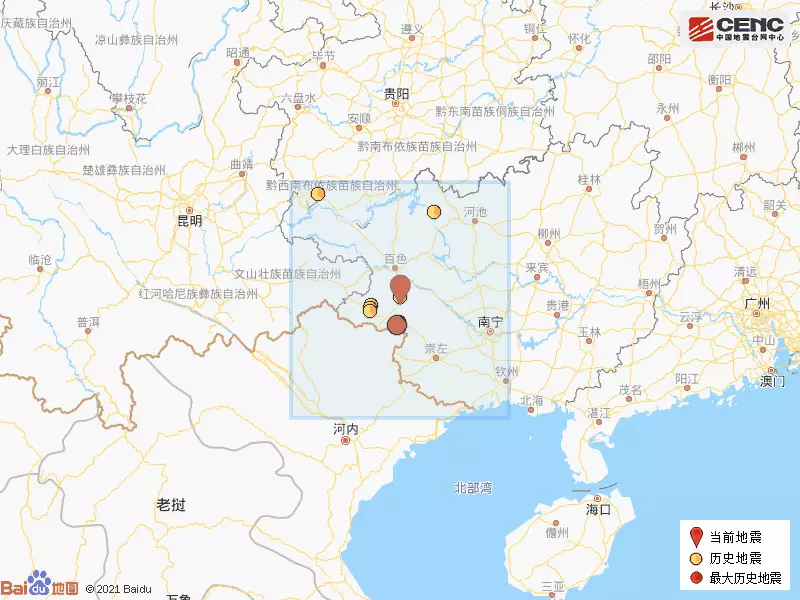 歷史地震: 根據中國地震台網速報目錄,震中周邊200公里內近5年來發生3級以上地震共11次,最大地震是2019年11月25日在廣西百色市靖西市發生的5.2級地震(距離本次震中56公里),歷史地震分佈如圖。