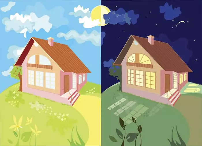內容:準備兩張早上和晚上的圖片,指著早上的圖畫問孩子:「這是白天還是晚上,天上有甚麼?」「樹上有甚麼?」等﹔之後換成另一幅圖畫,進行類似的提問遊戲。