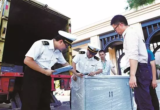 2013年7月,澳門大學橫琴校區「入伙」,橫琴海關關員在對首批遷校物資進行驗放 俞波 攝