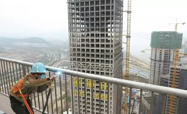 2016年,橫琴總部大廈樓頂工人們正在作業,旁邊已是高樓林立 羊城晚報記者 林桂炎 攝