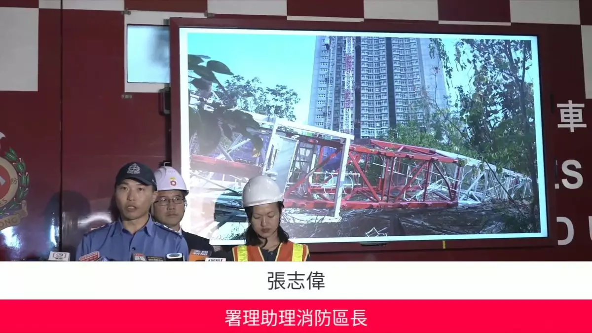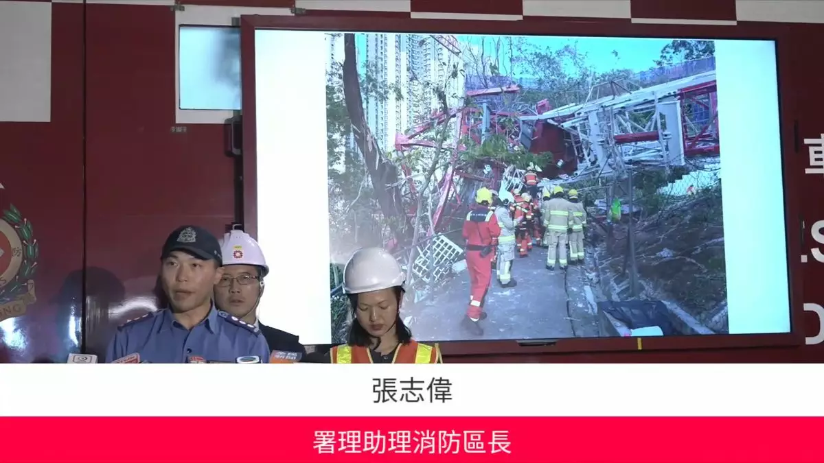 消防處、勞工處、房屋署晚上向傳媒交代天秤倒塌導致一名工人喪命事件。消防處FB直播截圖