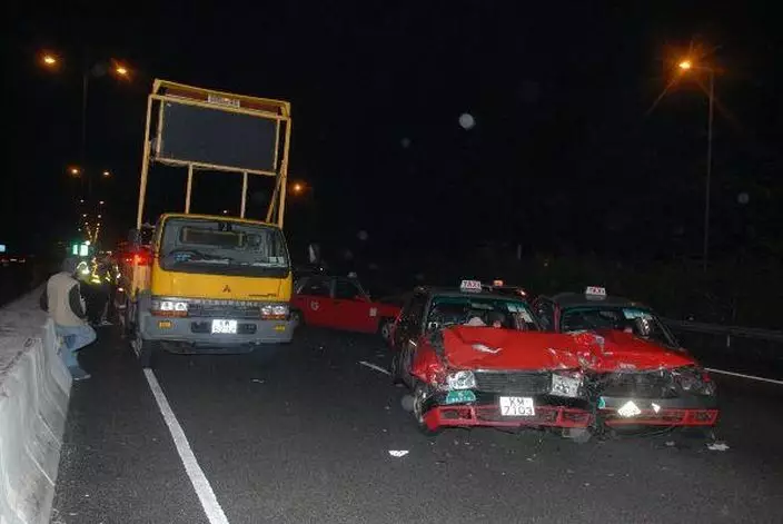 一輛的士在北大嶼山公路為閃避工程車急轉行車線,但仍撞到工程車車尾,尾隨兩輛的士亦收掣不及相撞,兩名的士司機受傷送院。