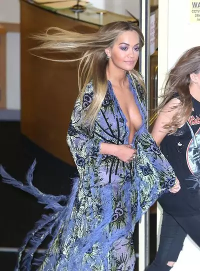 英國歌手Rita Ora身穿大Deep V花裙與朋友在倫敦夜蒲,落車時不慎露點,尷尬以笑遮醜。