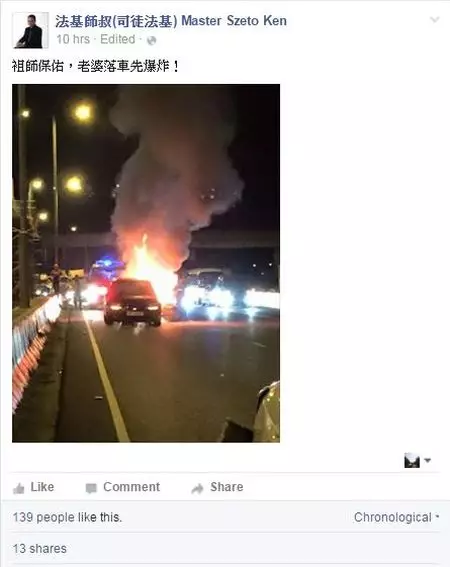 玄學家司徒法正兒子司徒法基在facebook透露,其妻是其中一架被焚毁私家車的司機,並留言表示:「袓師保佑,老婆落咗車先爆炸!」