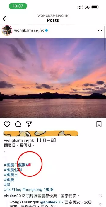 根據網上圖片顯示,帖文中其中一個標籤「#國慶日假期」,竟附上台灣青天白日滿地紅旗的emoji。至下午,本報在帖文內未有發現相關的emoji,相信已被刪走。