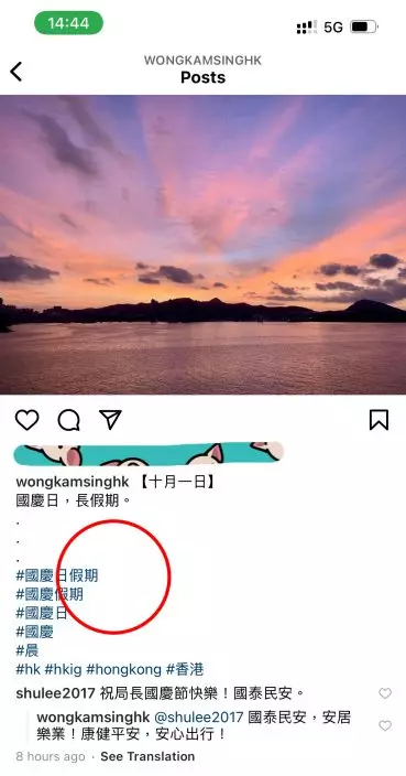 環境局局長黃錦星今早在社交平台Instagram發帖,上載一張晨光海景照片,配以文字「國慶日,長假期」,以及多個標籤(hashtag),包括「#國慶日假期、#國慶假期、#國慶日、#國慶、#晨、#hk、#hkig、#hongkong、#香港」。