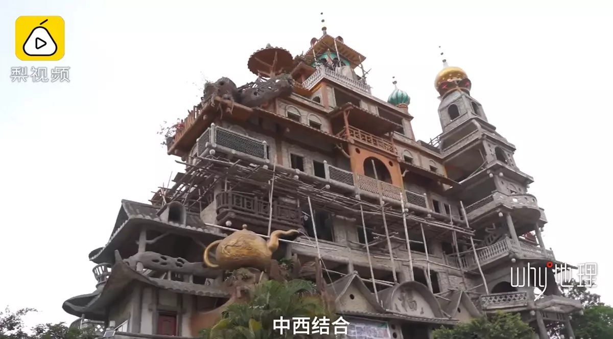 據內地媒體報導,廣西北流市農民李積光數年前開始搭建這棟怪樓,遠遠望去如同一座城堡的樓房採用了許多中式涼亭、法式圍欄,並加上俄羅斯風圓頂,仔細看相當古怪、獨特。