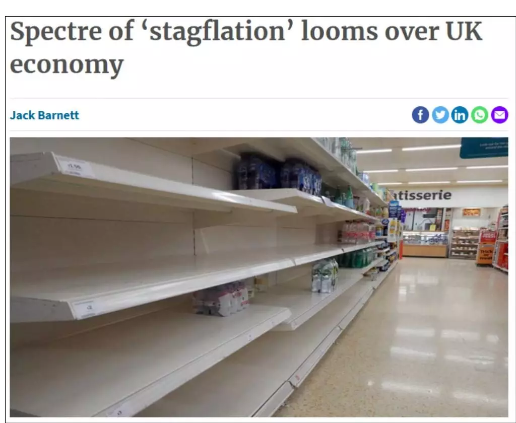 在經濟學中,「滯脹」通常伴隨著高通脹、高失業及不景氣的經濟。通俗而言,即物價上升,但經濟停滯不前,它是通貨膨脹長期發展的結果。而在英媒看來,如今的英國正面臨著這樣的危機。