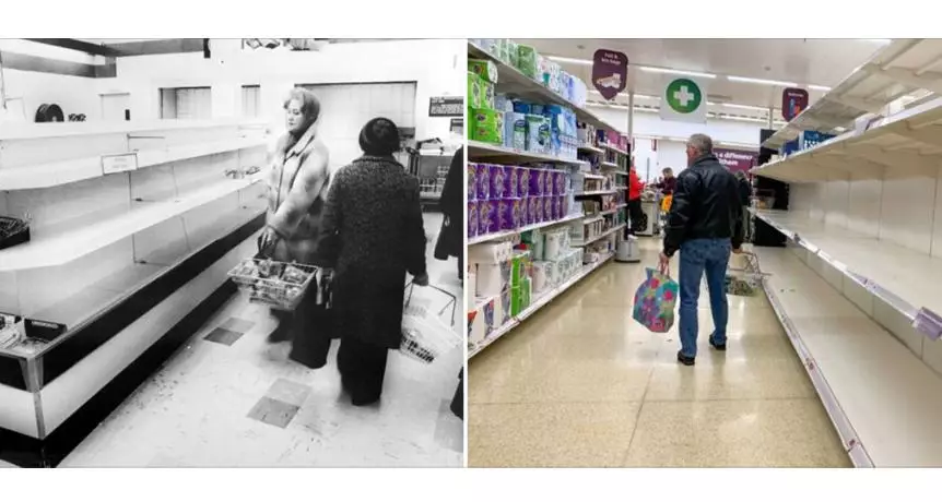 1971年1月英國市場商品短缺(左)以及2021年3月英國市場商品短缺(右) 。