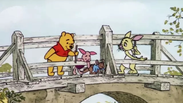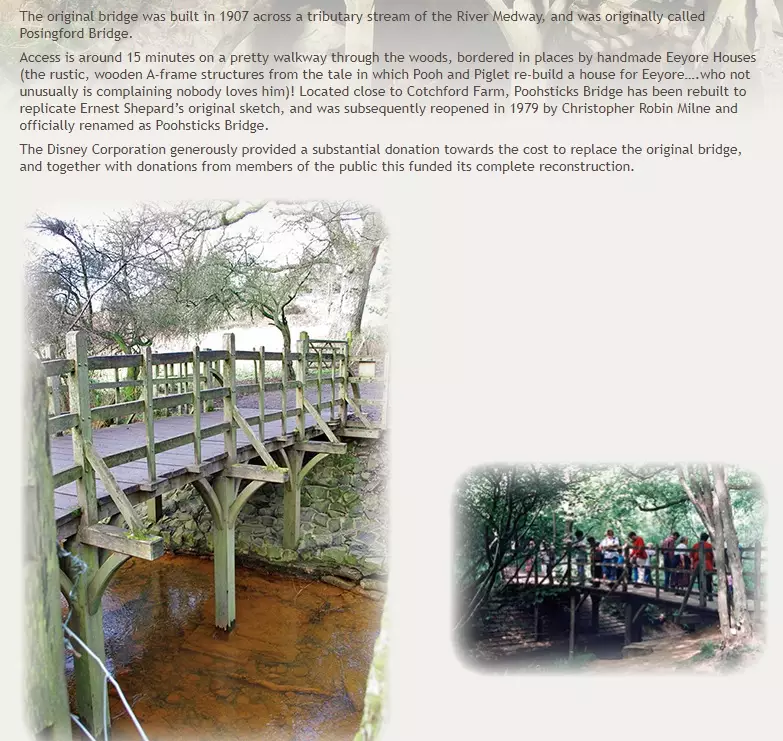 據悉,這座橋梁建於1907年,舊名為Posingford Bridge,是作者生前和兒子Christopher Robin不時前去玩耍的地方,之後被他畫入維尼故事當中而成名。直到1997年才被其兒子命名為Poohsticks Bridge,其被無數遊客拜訪後磨損不堪,由迪士尼贊助新建橋梁後拆除。