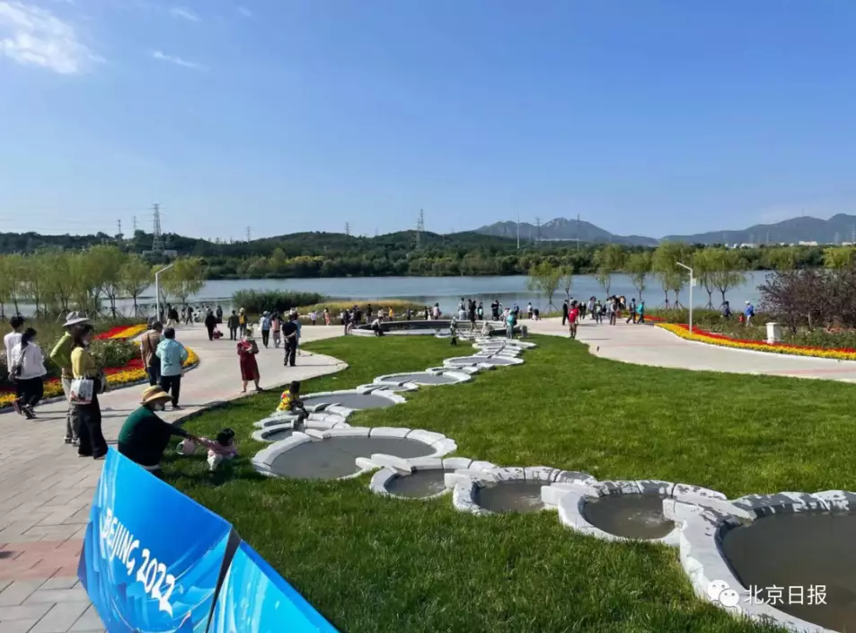 10月1日,北京冬季奧林匹克公園正式開園迎客。跑馬大本營裝飾一新,新建成的跑馬路線和濱水綠道嶄新亮相,河堤路邊還有親子樂園,吸引市民紛紛到此打卡遊覽,一個融合「冬奧」“永定河”“西山”“首鋼工業”等元素的親水活動樂園成為市民十一出遊的熱門選擇。