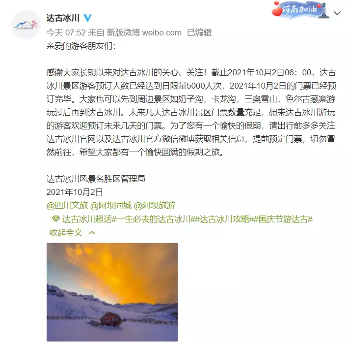 截至2021年10月2日06:00,達古冰川景區遊客預訂人數已經達到日限量5000人次,2021年10月2日的門票已經預訂完畢。