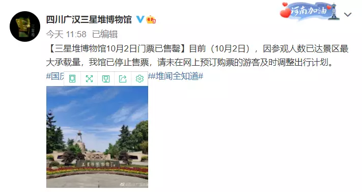 據@四川廣漢三星堆博物館 消息:目前(10月2日),因參觀人數已達景區最大承載量,三星堆博物館已停止售票,請未在網上預訂購票的遊客及時調整出行計劃。