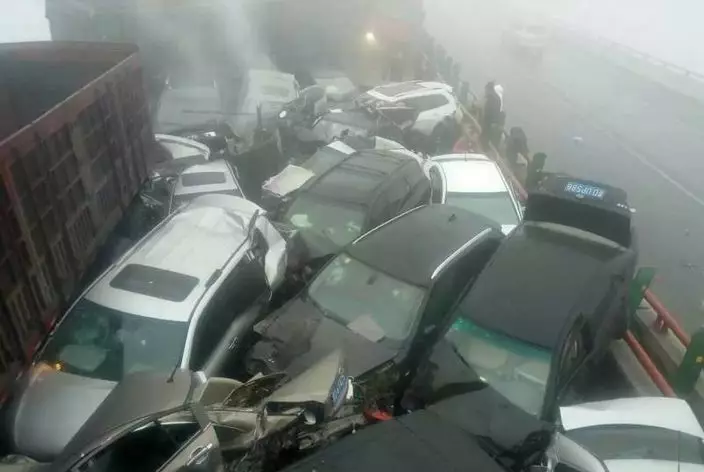 內地北方地區大範圍霧霾,山西太長高速公路太原方向王村橋路段下午疑因大霧能見度低釀33車相撞,最少六死四傷。
