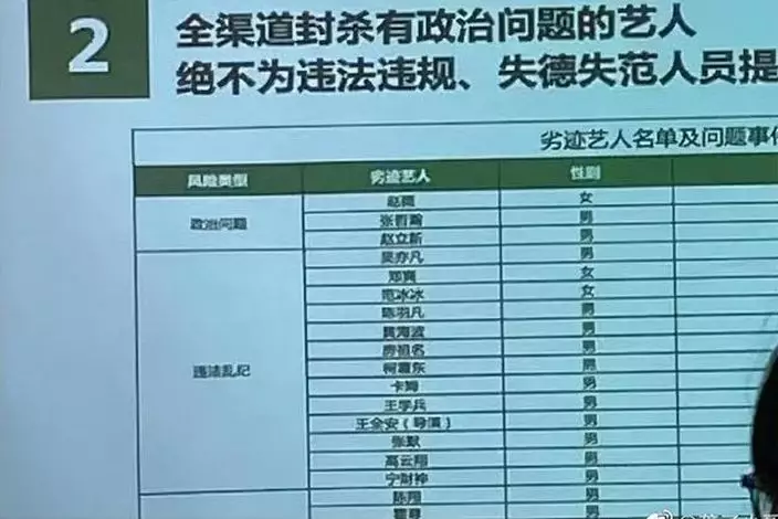 至於第三類「失德失範」藝人名單,多是私生活不檢點,包括去年被周揚青爆喜愛多人運動的羅志祥、有婚外情的金馬影后李小璐、文章、吳秀波等。不過此25人名單未獲證實。