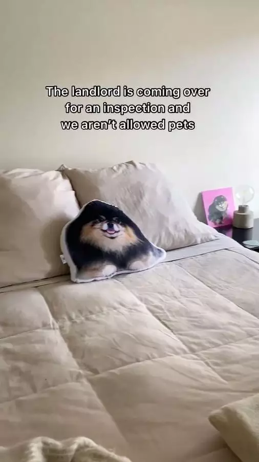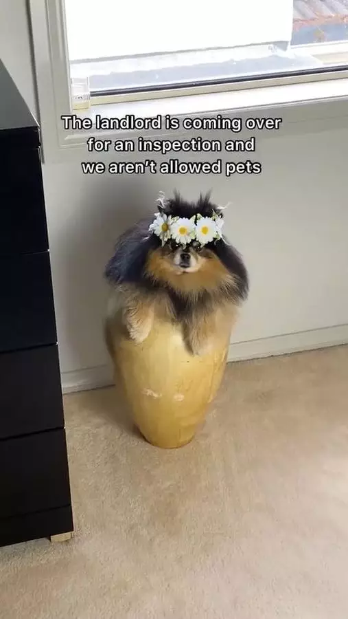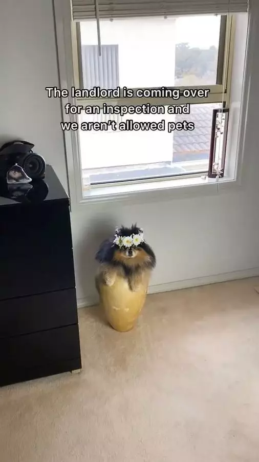 澳洲有狗主就在社交平台分享影片,寫道:「屋主要來檢查,但我們不被允許養寵物」,影片中,臥房看上去沒有任何着毛孩有關的蛛絲馬跡,只有印松鼠狗的枕頭和照片,但在影片結束前,可以見到櫃子旁、窗前有一個毛茸茸的花瓶,原來是狗狗戴著花環在偽裝自己是花!