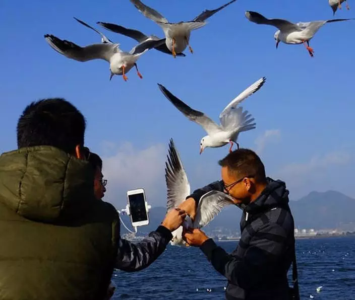 微博網民「荷塘那荷花」在昆明海埂大壩拍攝海鷗時,看見有遊客捉著一隻掙扎的海鷗,面對兩個拿著自拍竿和手機的朋友滿臉笑容準備自拍:「看到他們虐鷗,感覺心痛,便上前制止。」但遊客卻稱覺得好玩才捉住海鷗。