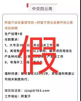 網上大範圍流傳「中交四公局招聘阿富汗戰後重建項目-阿富汗南北走廊環線公路項目國別經理、生產經理」等虛假信息。