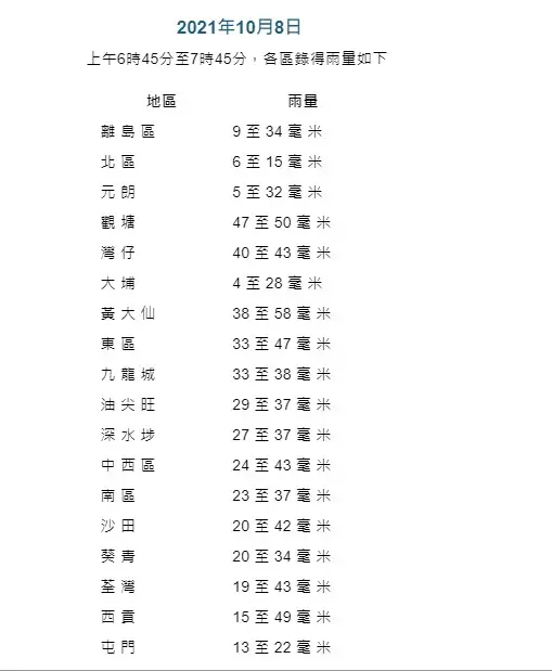 據天文台網頁資料,黃色暴雨警告信號表示香港廣泛地區已錄得或預料會有每小時雨量超過30毫米的大雨,且雨勢可能持續。而紅色暴雨警告是50毫米的大雨,黑色警告是超過70毫米的豪雨。據天文台的本港各區雨量記錄,在上午6時45分至7時45分,只有少數地區錄得約50毫米雨量,包括西貢錄得雨量15至49毫米、觀塘錄得雨量47至50毫米、黃大仙錄得雨量38至58毫米。