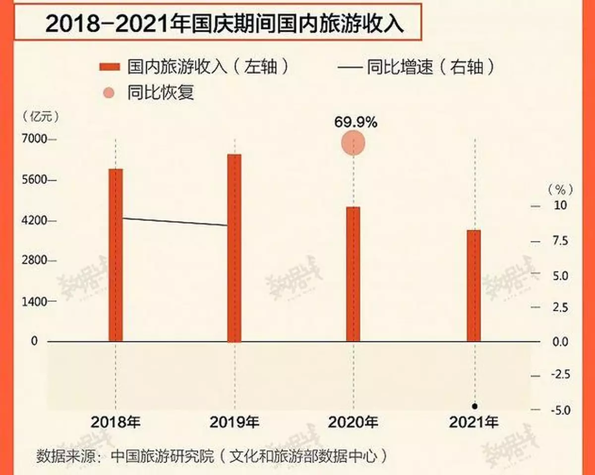 2018年至2021年國慶期間國內旅遊收入。中國旅遊研究院數據