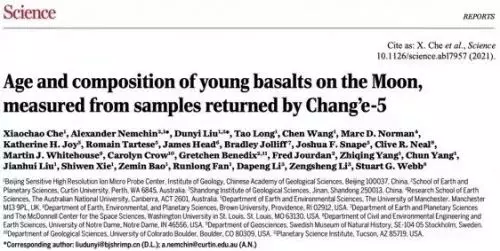 相關研究論文《嫦娥五號年輕玄武岩的年代與成分》於北京時間10月8日凌晨在線發表在國際學術期刊《Science》上。這是以嫦娥五號月球樣品為研究對象發表的首篇學術成果,劉敦一研究員與Alexander Nemchin教授為本文的共同通訊作者,車曉超博士是本文的第一作者。