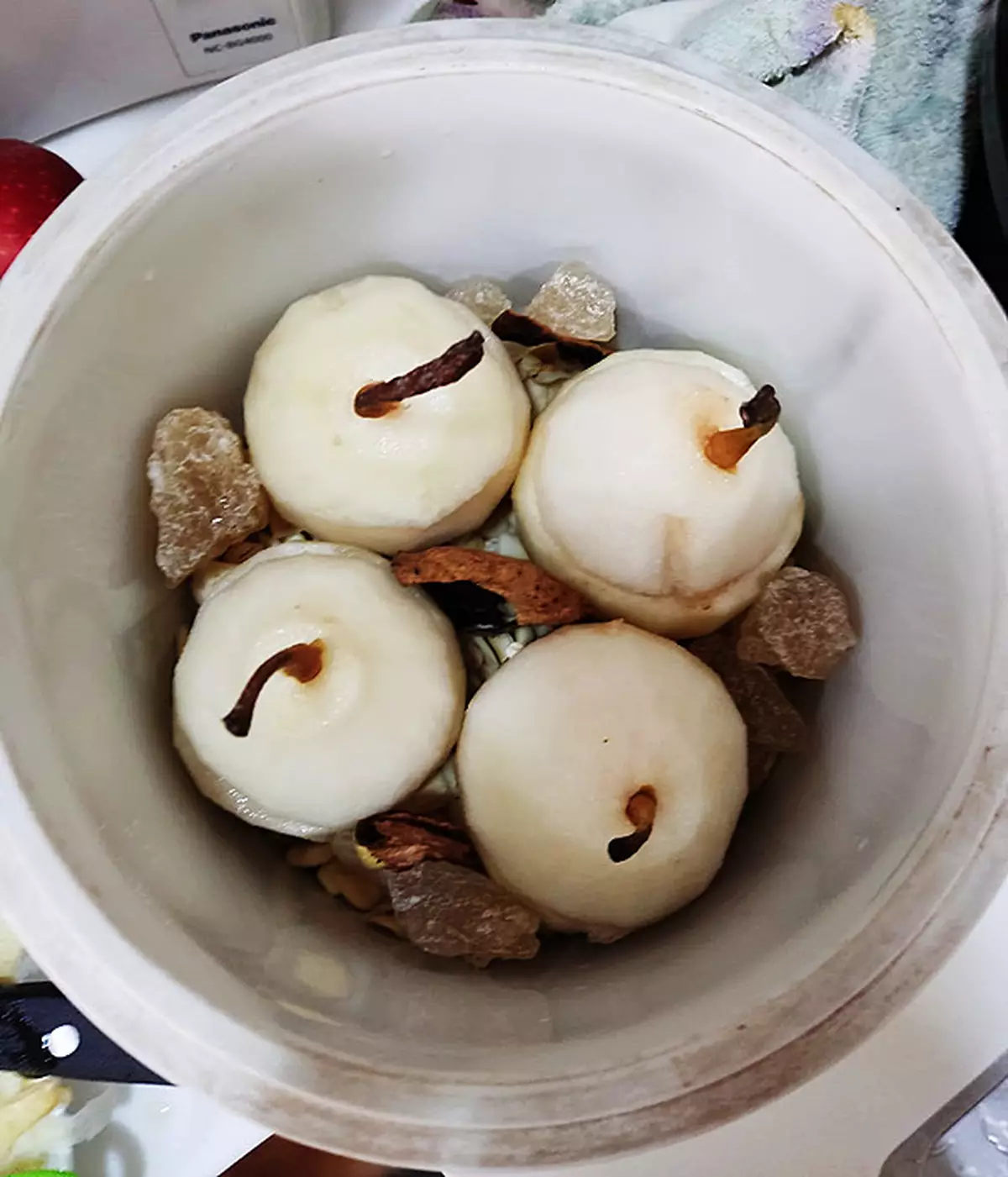 蓋回雪梨頭,南北杏乾百合放在盅底,四個雪梨放上南北杏乾百合上去燉。
