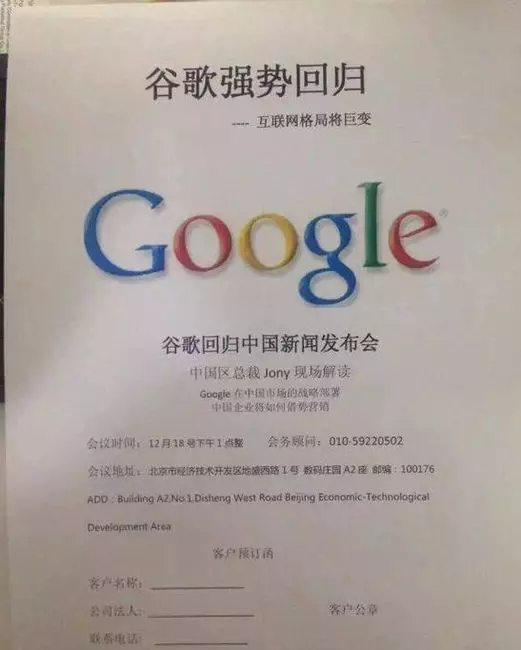 一張題為「谷歌回歸中國新聞發布會」圖片在微博上廣泛流傳,引起網民熱論。不過,Google中國公關否認事件,澄清中國區並無中國區總裁Jony此人。