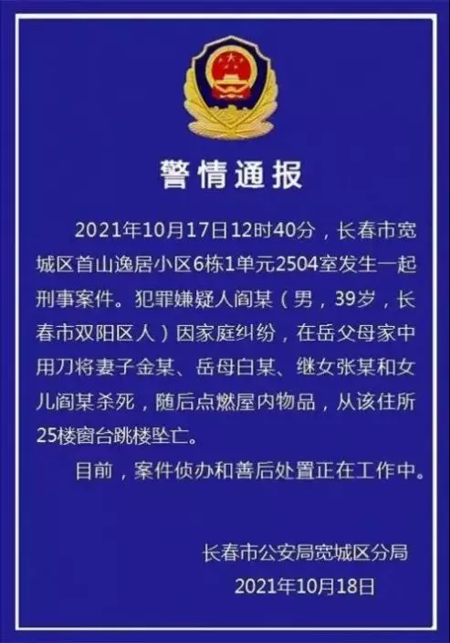 10月17日中午12時40分,吉林省長春市寬城區首山逸居小區6棟,發生一起重大刑事案件。18日上午,長春市公安局寬城區公安分局發佈警情通報稱,系犯罪嫌疑人閻某(男,39歲,長春市雙陽區人)因家庭糾紛,殺死家中四人後,跳下25樓身亡。