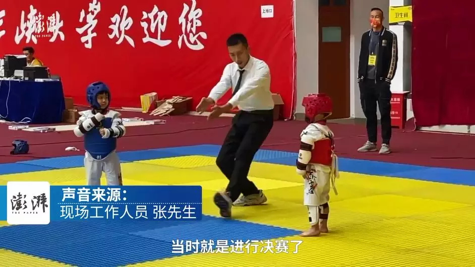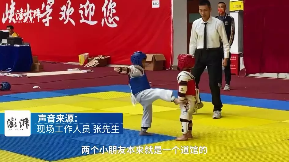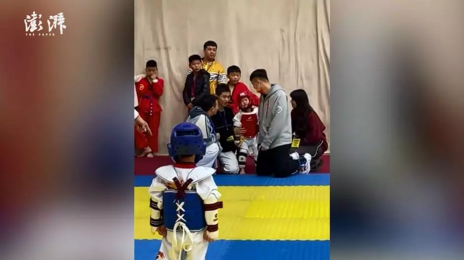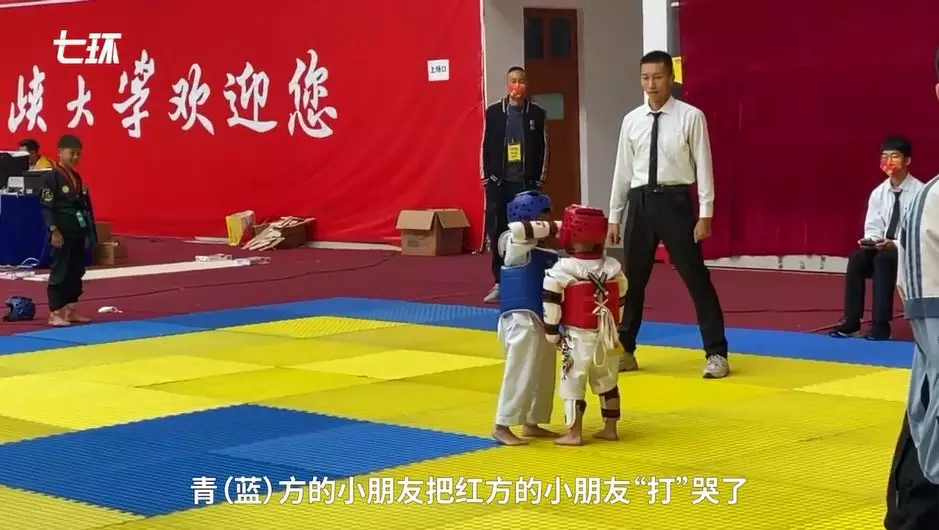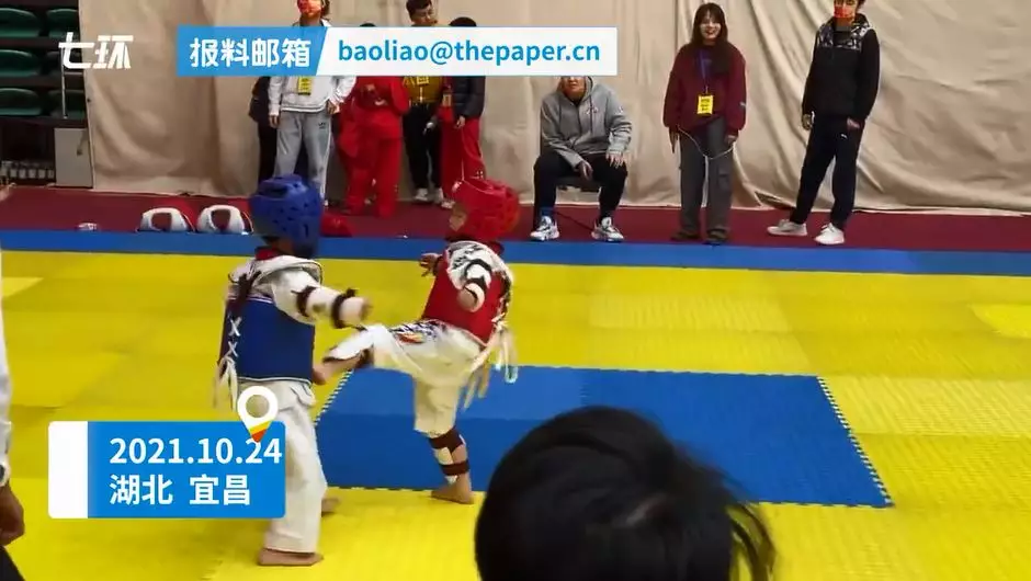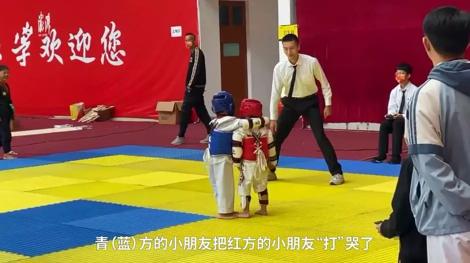 綜合內媒報道,湖北宜昌一間跆拳道館10月24日舉辦比賽,其中在幼兒組決賽中,兩名男童在場上互相起腳角力,戰況十分激烈,期間身穿紅色護具、頭戴紅色頭盔的男童突然停下手腳,站在場中大哭,估計是被踢到感到很痛。裁判馬上上前分開二人,紅方男童隨即跑到賽外,由隊友及導師們安慰,藍方男童則一臉茫然。