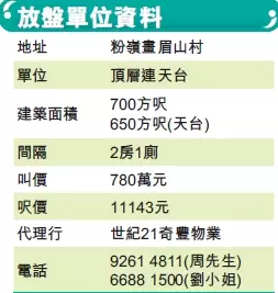 位於粉嶺的畫眉山村,鄰近華明邨及雍盛苑,日常採購及出入方便,是次精選該處的一個頂層連天台戶放盤,建築面積700方呎,採2房1廁間隔,屋內保養得宜,連650方呎天台,可享山景及附近樓景,現叫價為780萬,建築呎價約11143元。