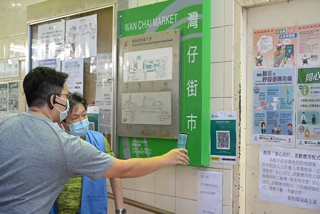 另一邊廂,灣仔街市各個出入口都貼有4至5張「安心出行」二維碼,亦有食環署人員看守,協助長者及外傭掃二維碼,市民入內時自動自覺掃「安心出行」,秩序大致良好。