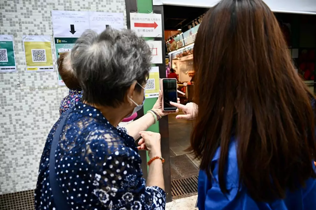 灣仔街市亦有食環署人員看守,協助長者及外傭掃二維碼。