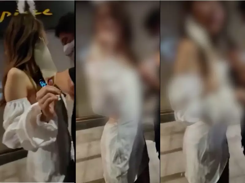 網上近日流傳一段影片,一名穿著白色露肩上衣配白色短裙的年輕女子,站在街頭吸食電子煙,從側面觀察可見到她未有穿上內衣,上半身更見走光,同時有一名戴口罩的男子在她胸前有所動作,疑似為其綁好上衣,免她繼續走光。